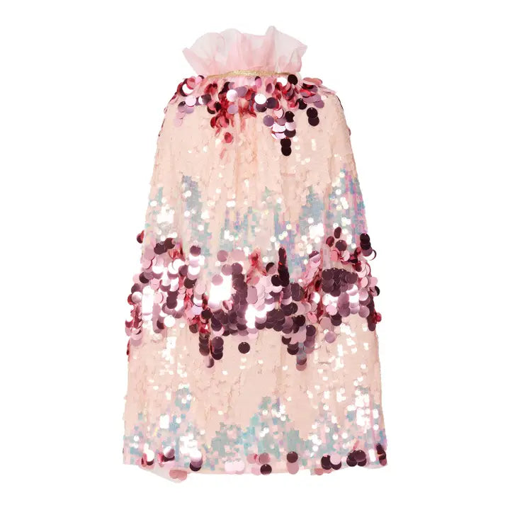 This unique tulle princess cape is studded from top to bottom with shiny sequins in various sizes and in various shades of pink.