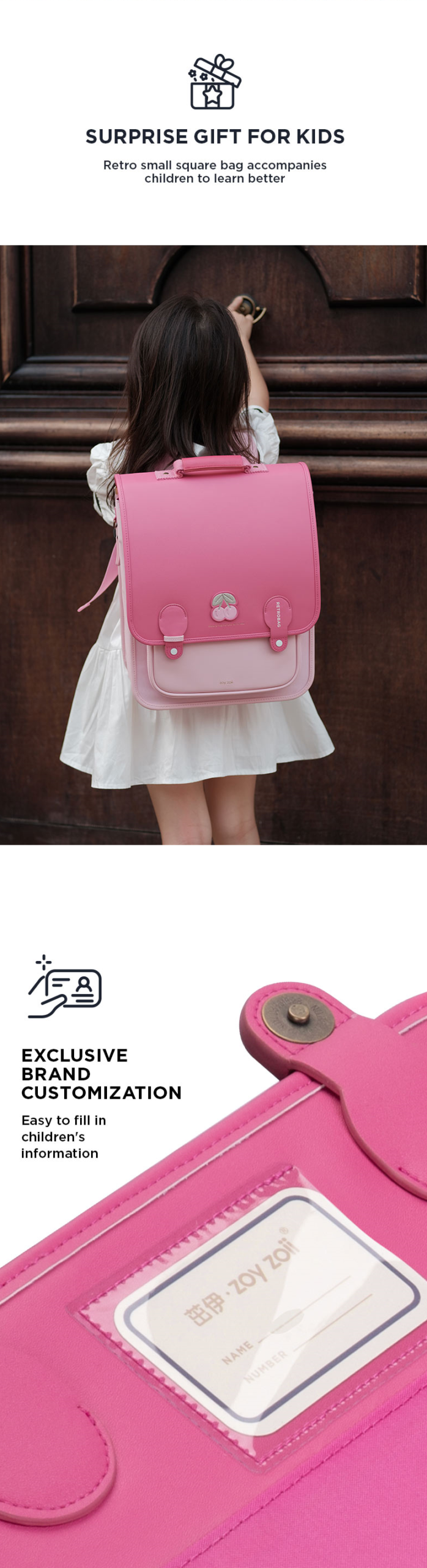 Special slot for easy filling in children's information, such as their name, their identity Suitable for children aged 1 to 10 years. Dimensions 28.5x14.5x33 cm