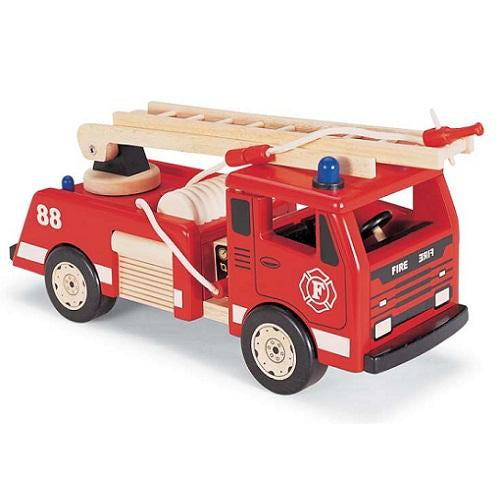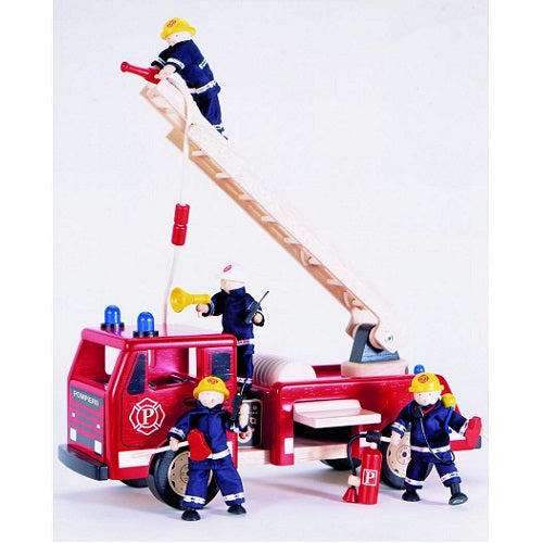 Wooden fire truck from Pintoy. It is made of solid rubber wood and ecological paints and varnishes. The corners are not sharp so that there is no risk of injury. The packaging is made of recyclable materials.