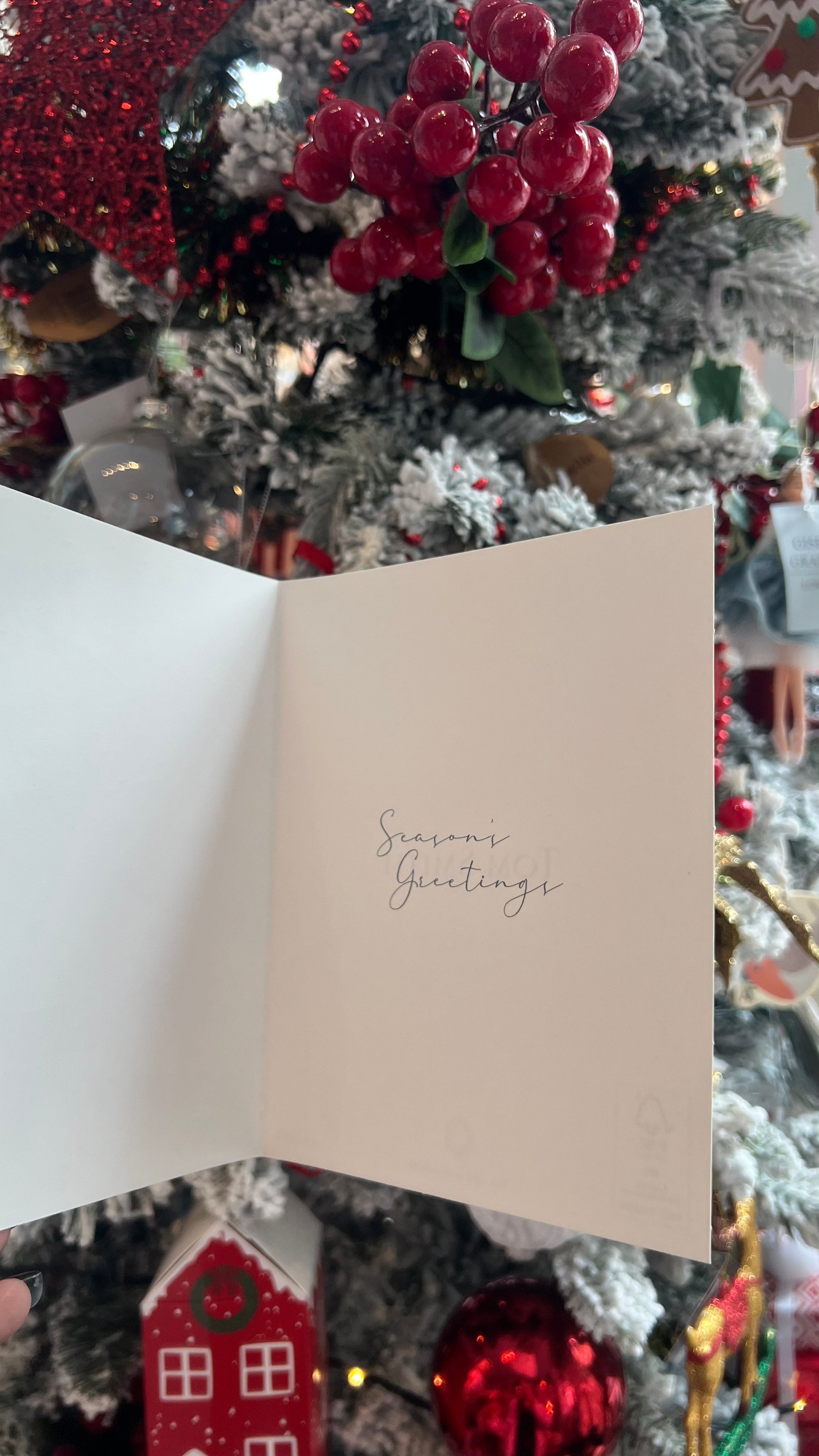 The card is decorated with metallic silver details that reflect the light, adding elegance and a subtle, festive glow to the overall image.