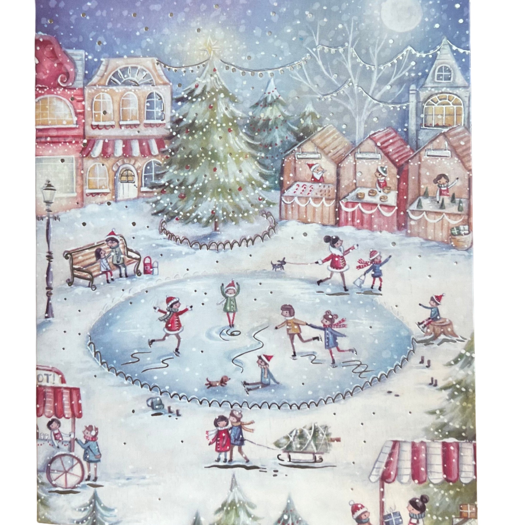 A stunning 25 x 15.5 cm Christmas card features a dreamy, snowy village. In the center of the landscape is a frozen lake where people are skating, creating a lively, festive scene. The roofs and trees are covered in fluffy snow, while a beautifully decorated Christmas tree shines in the winter landscape.