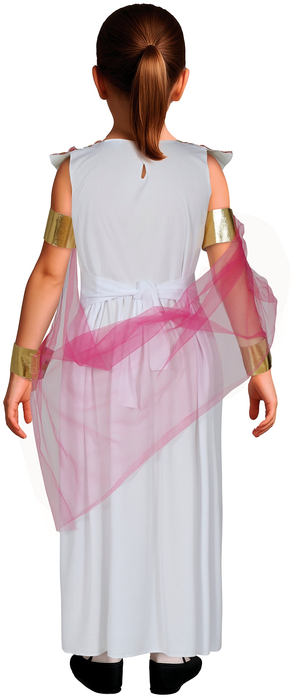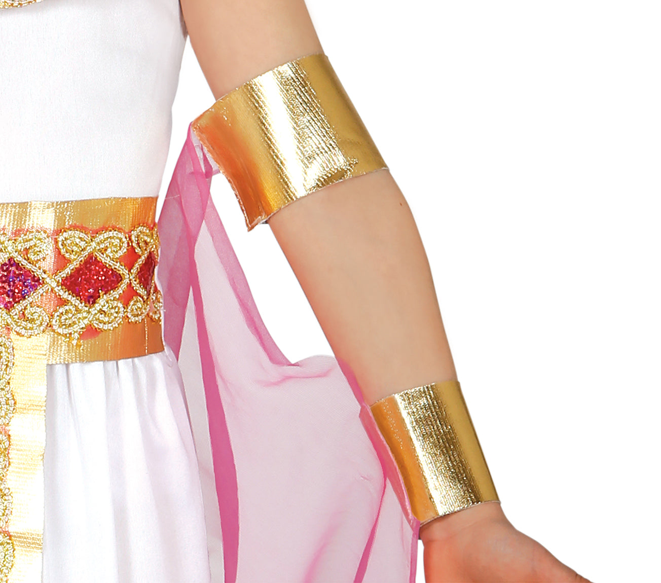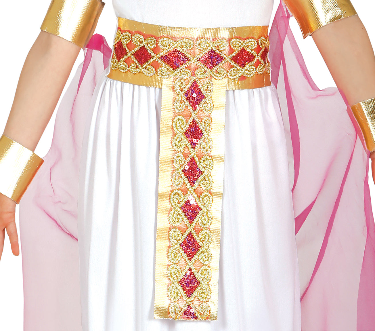 The costume includes an impressive dress, a decorative belt that highlights the silhouette, fabric gold bracelets for an elegant touch and a tulle cape that adds magnificence to the look.