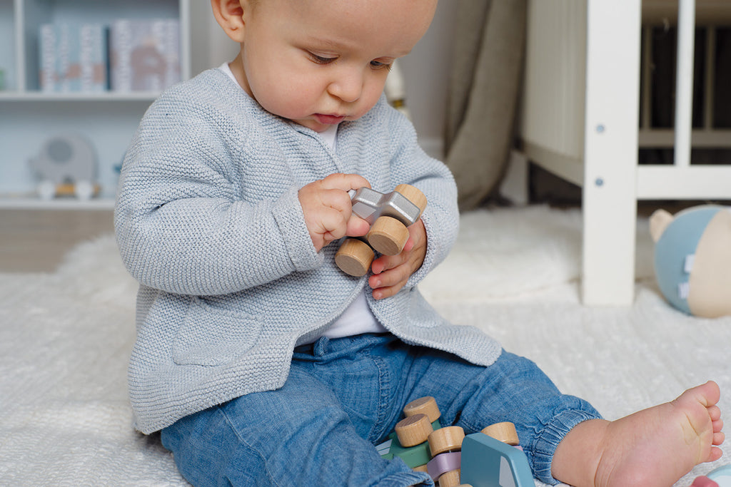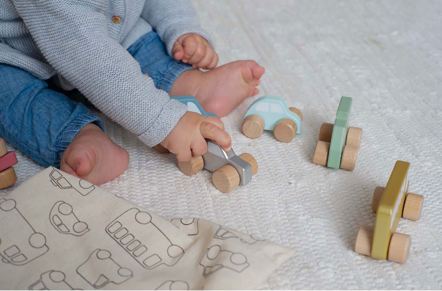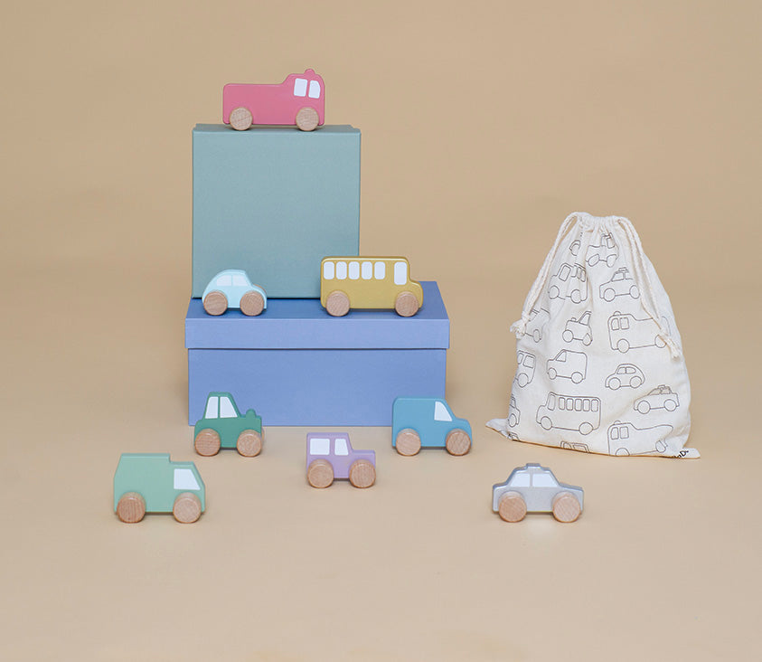 Wooden cars in a size that can be held by little hands, with bright colors completely safe for children and with round big wheels to slide easily!