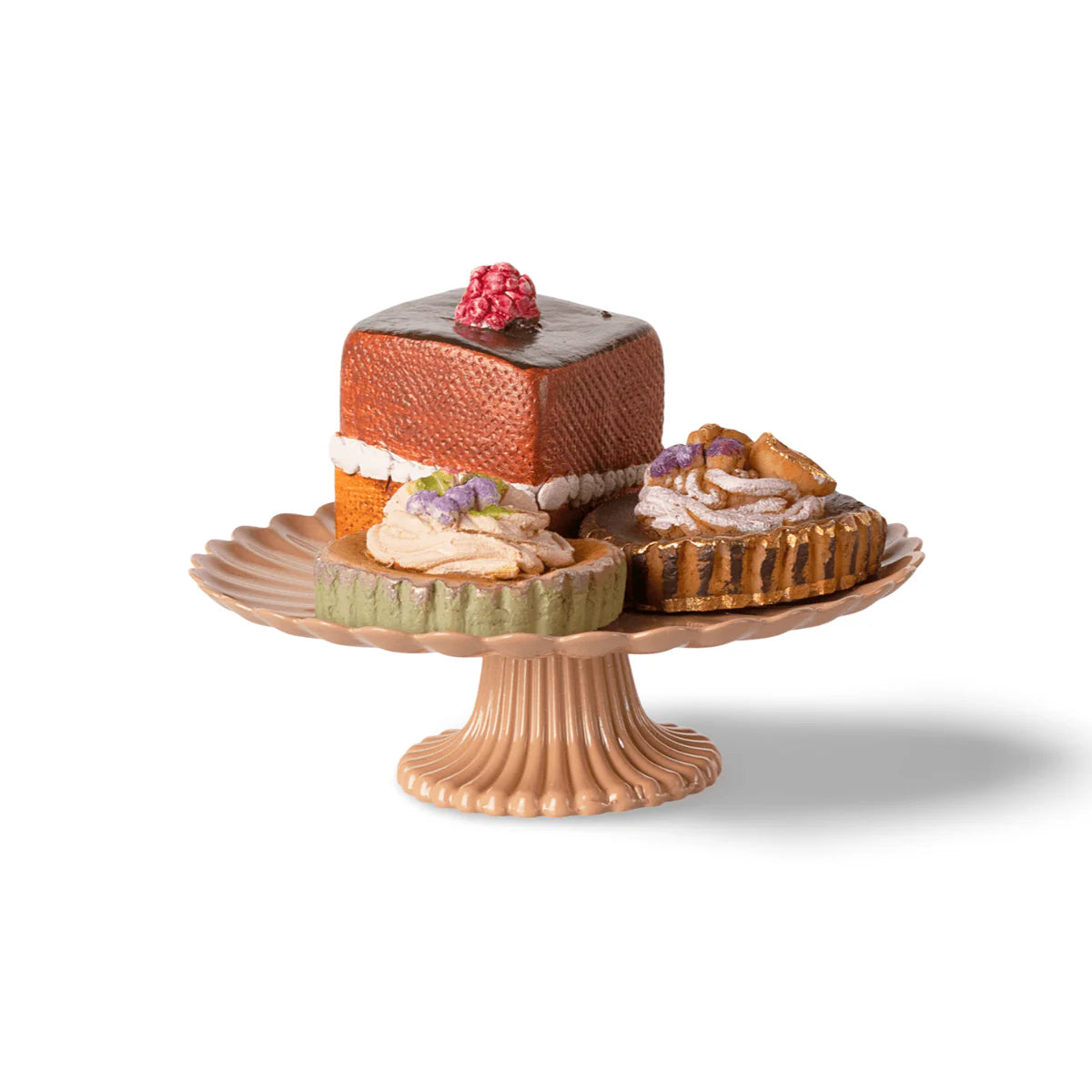 This little set of 3 delicious cakes on a beautiful decorated cakestand in rose color is a must have. The cakes are thoroughly decorated by hand.