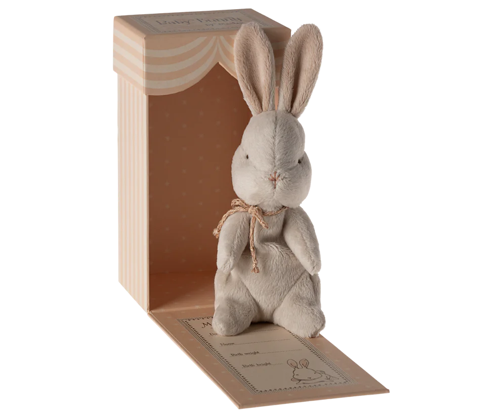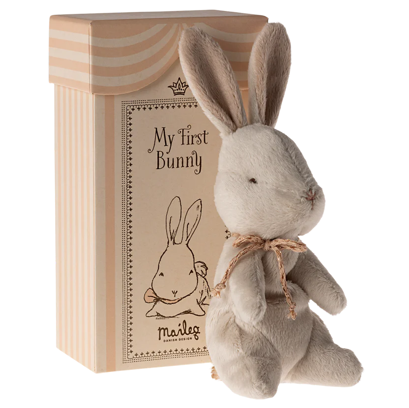 My first bunny is perfect for small hands. It is made in a soft plush quality and has a colored ribbon around the neck. It comes in a beautiful gift box, inside you can add the birth information.