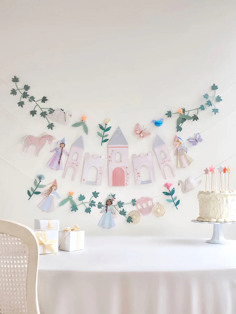 Princess Party Garland Create a magical fairy tale world with this most impressive Princess garland! The unique shapes of princesses, flowers, carriages, swans and unicorns will delight all your guests. Perfect for decorating a children's room too.