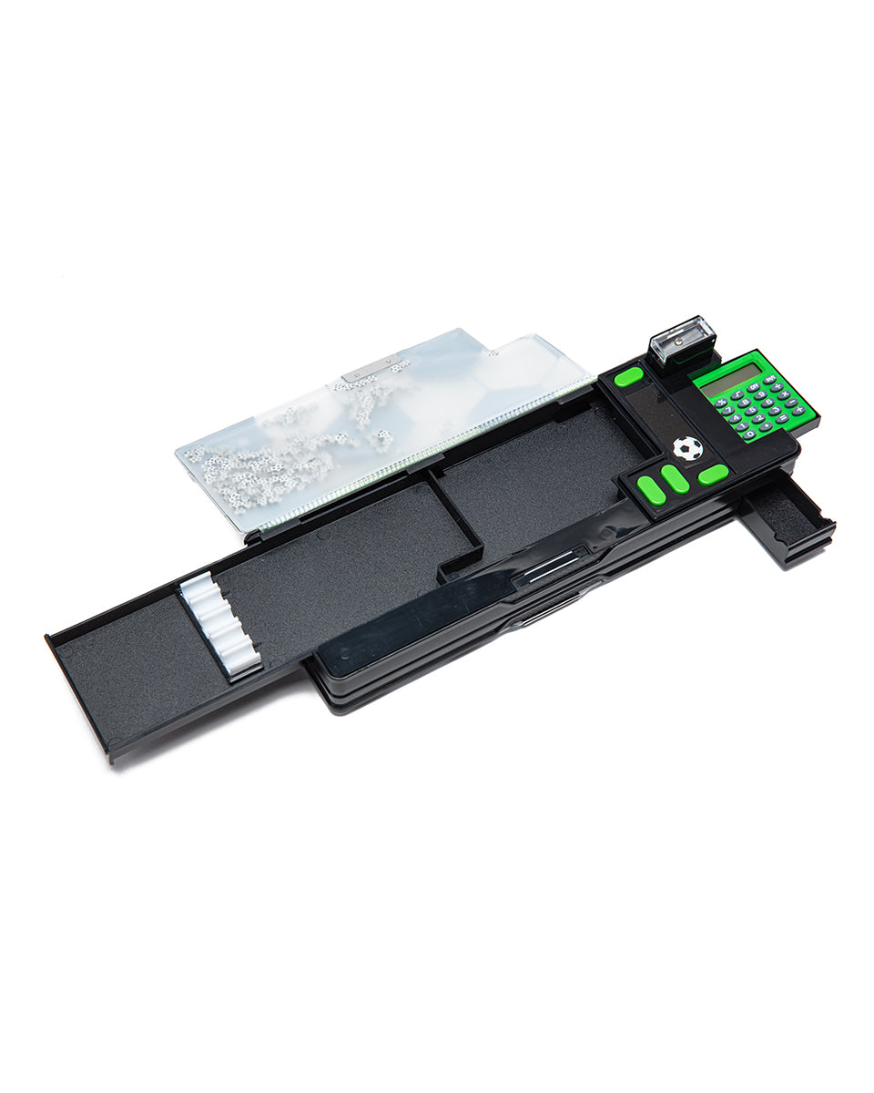 The retro casket is a mystery to explore... Kids push the buttons and discover the little computer, secret compartments, a pencil sharpener and more.
