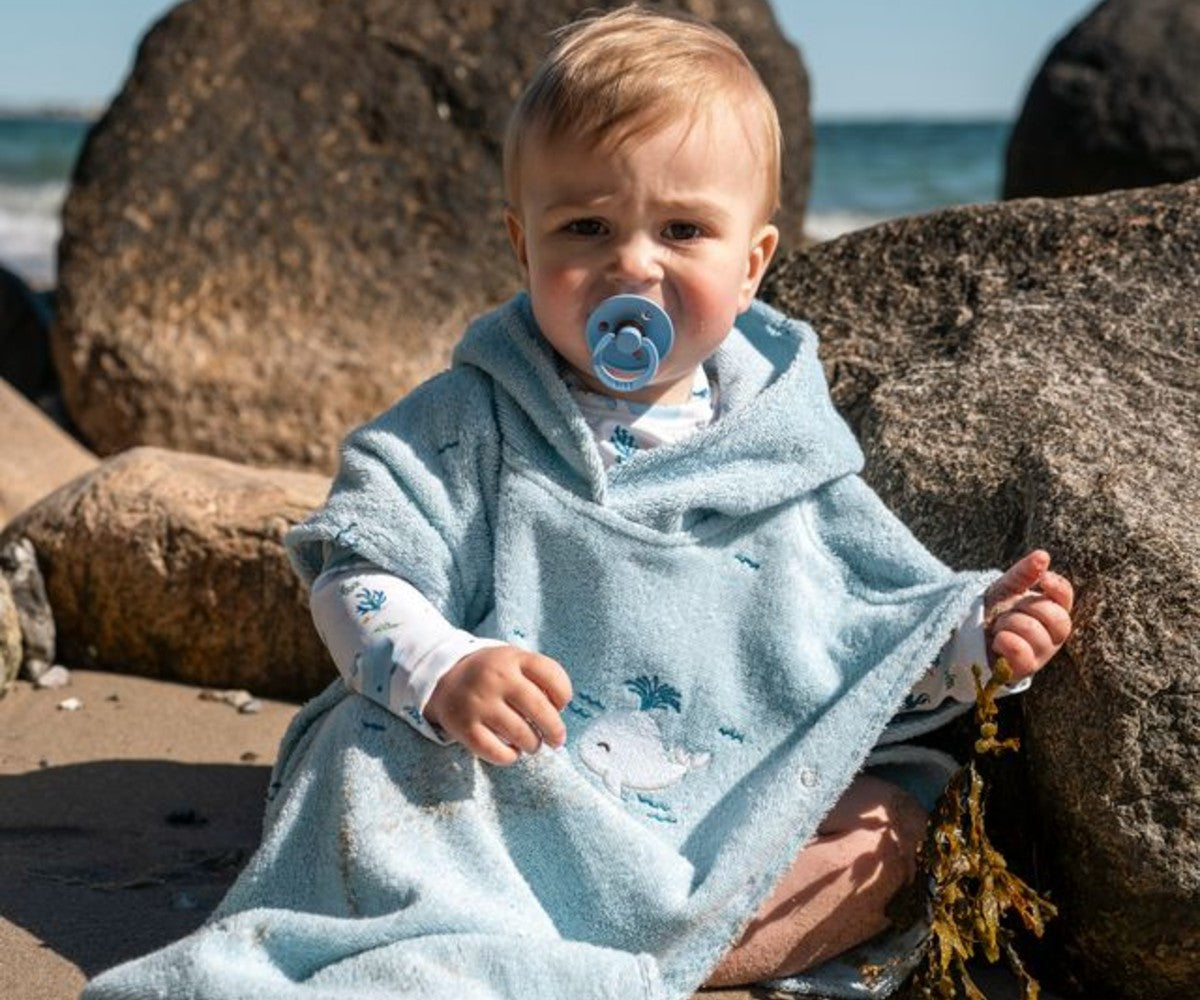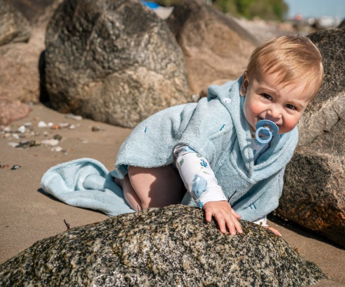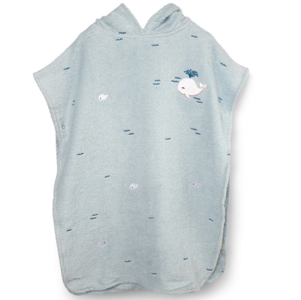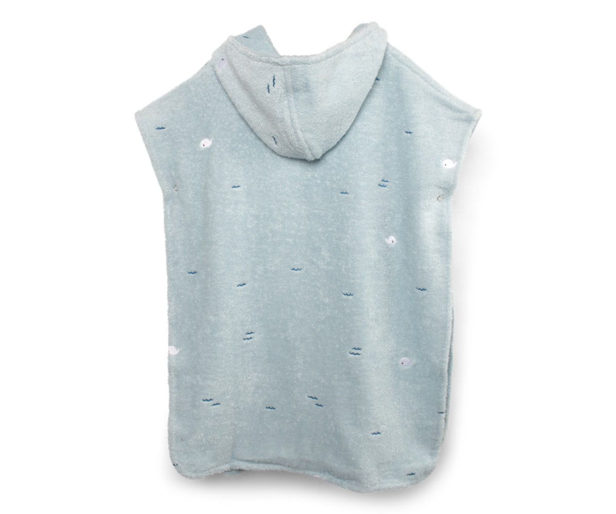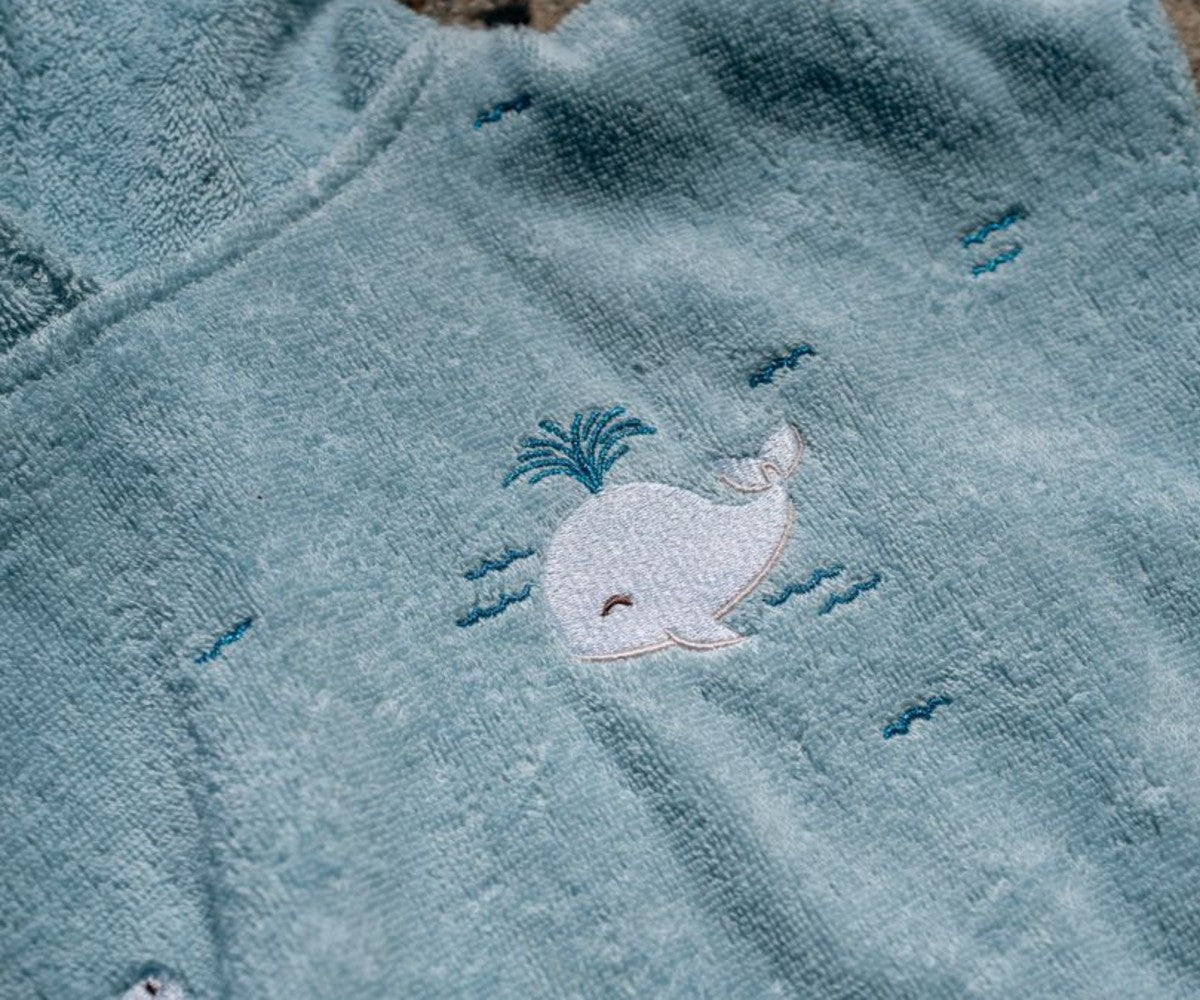 The children's beach poncho is made of 100% organic cotton in a particularly fluffy quality, with delicate embroidered details. The clever buttons on the sides ensure that the poncho sits well on the body while the child plays, offering safety and comfort.