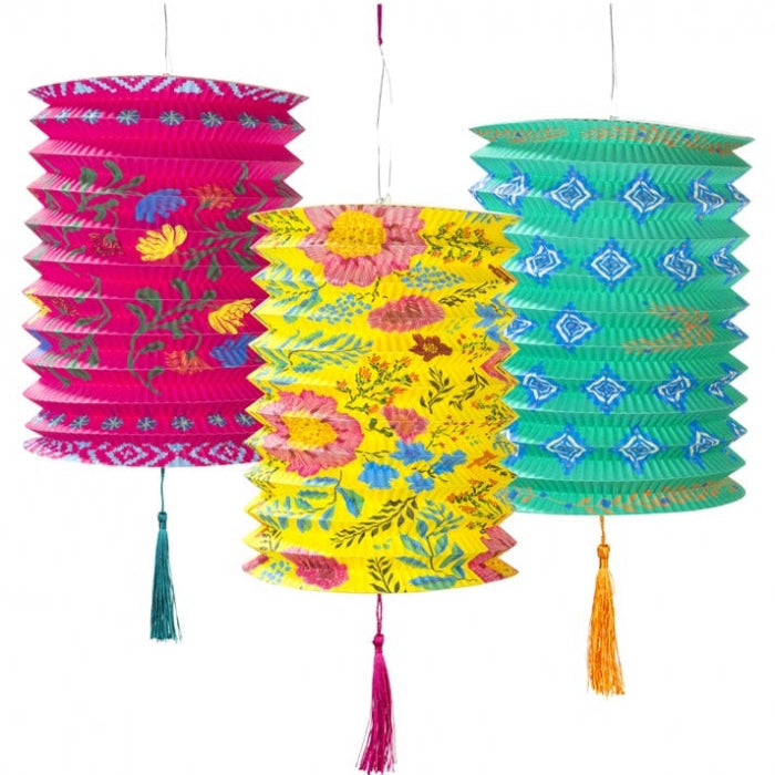 Paper lanterns in 3 colors with fabric tassels. Hang them high and complete your decoration with a boho mood! They combine perfectly with other products of the same series, garlands, plates, glasses, napkins and much more.