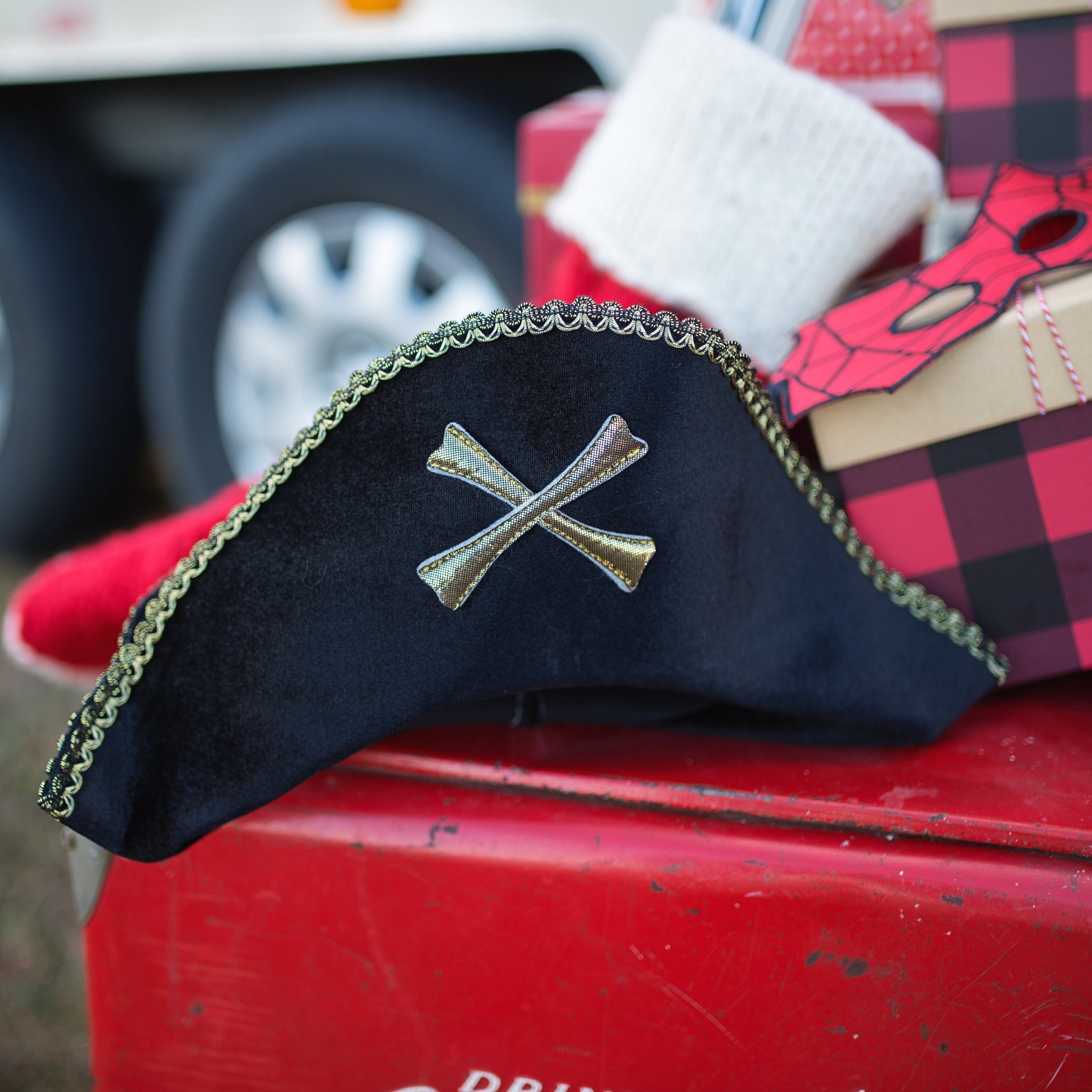 Any ship captain could use a pirate hat, why not make it the ultimate pirate hat! Crafted from soft black foam velvet, this hat is built to keep up with the fast paced life of a ship's captain. Decorated in metallic gold trim and featuring a sparkling pirate-inspired emblem. Marked with the legendary crossbones - the sure sign of a pirate leader for great gaming adventures!\n\nDimensions: 14x41x3cm\nAge: 3 years+