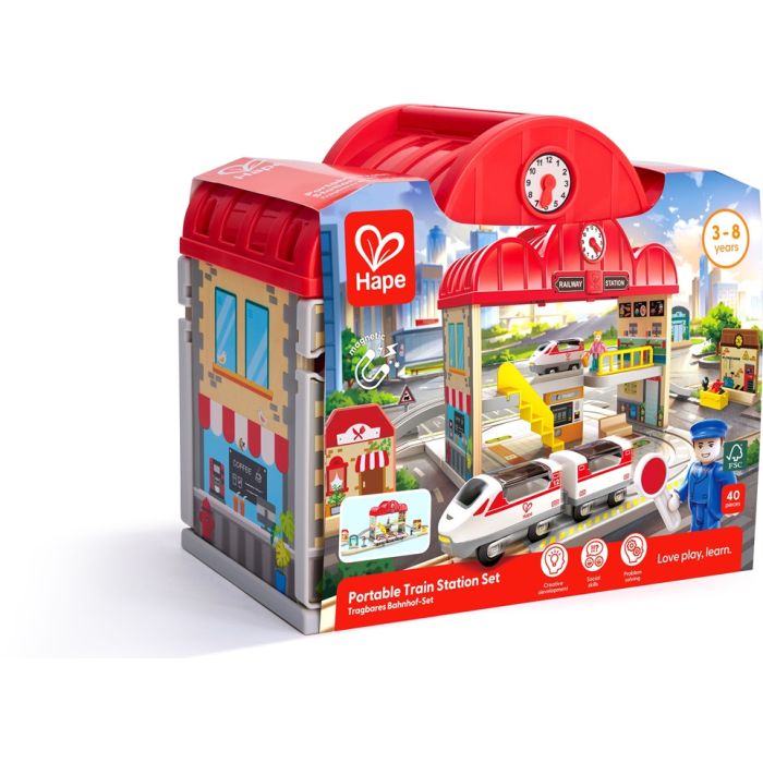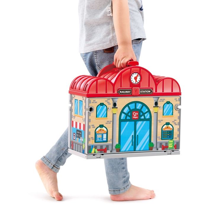 With approximately 41 pieces including tracks, a train with wagons, pipes and accessories, the set allows kids to build their own “city” of cargo and passengers — while the set’s case doubles as a portable station for easy transport and storage. Made of durable, environmentally friendly wood.