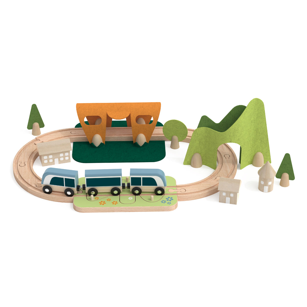 Αυτό το τρενάκι είναι πραγματικά πανέμορφο, γεμάτο δραστηριότητες και διακοσμήσεις από τσόχα που κρύβουν εκπλήξεις! Διαθέτει τούνελ, σταθμό και ένα παζλ με σχήματα που τα παιδιά πρέπει να ταιριάξουν για να ολοκληρώσουν τη διαδρομή. Πολύχρωμα λουλούδια και κρυμμένα ζωάκια τους βοηθούν να βρουν τα σωστά σχήματα. Τα ξύλινα τουβλάκια μπορούν να στοιβαχτούν για να σχηματίσουν σπιτάκια, τα οποία τοποθετούνται γύρω από τη σιδηροτροχιά. Το παιχνίδι αυτό ενισχύει τη δημιουργικότητα, τη γλωσσική ανάπτυξη, τις λεπτές κινητικές δεξιότητες και τον συντονισμό. Το ξύλο προέρχεται από δάση FSC και η τσόχα είναι κατασκευασμένη από ανακυκλωμένο P.E.T.