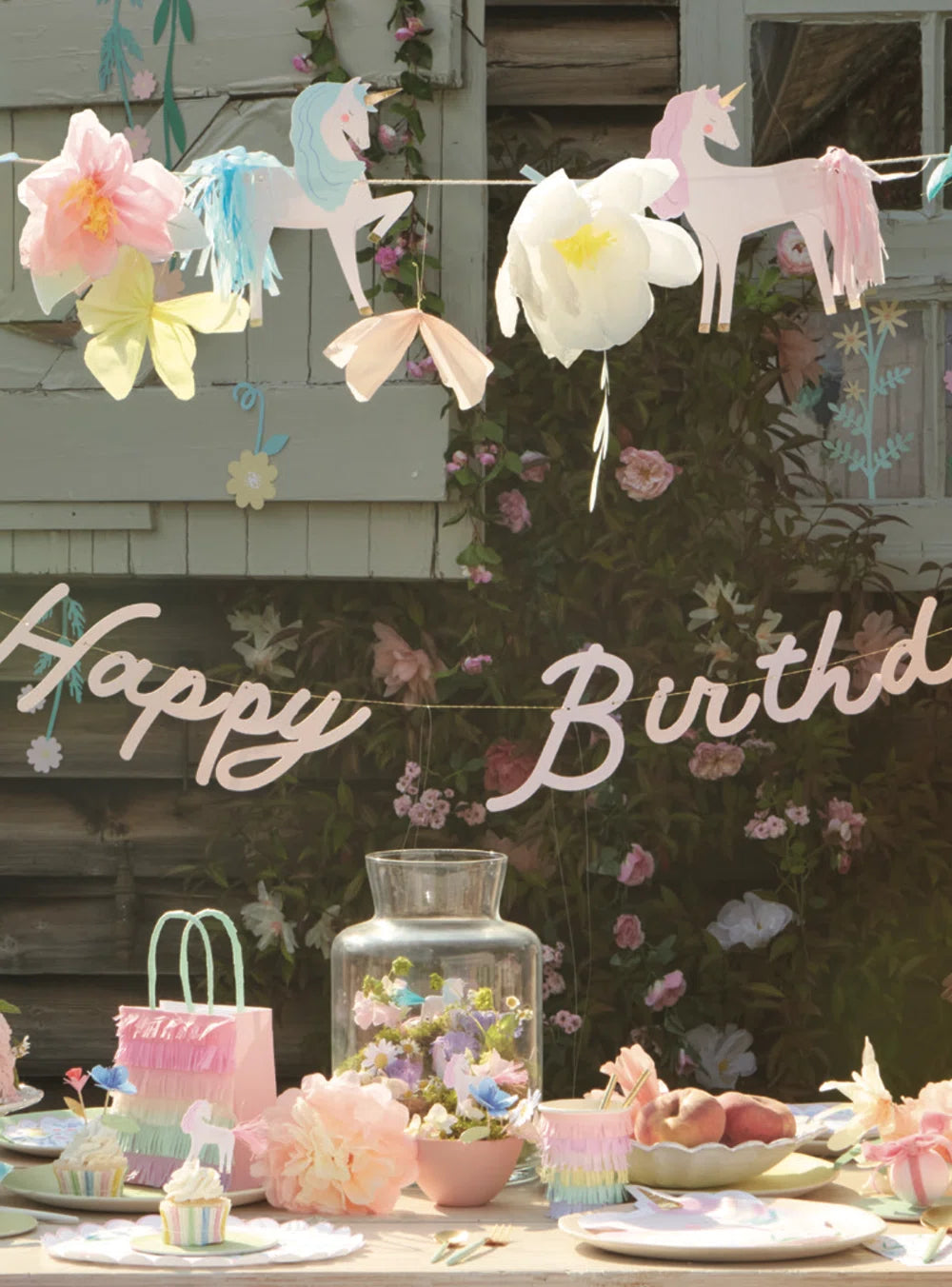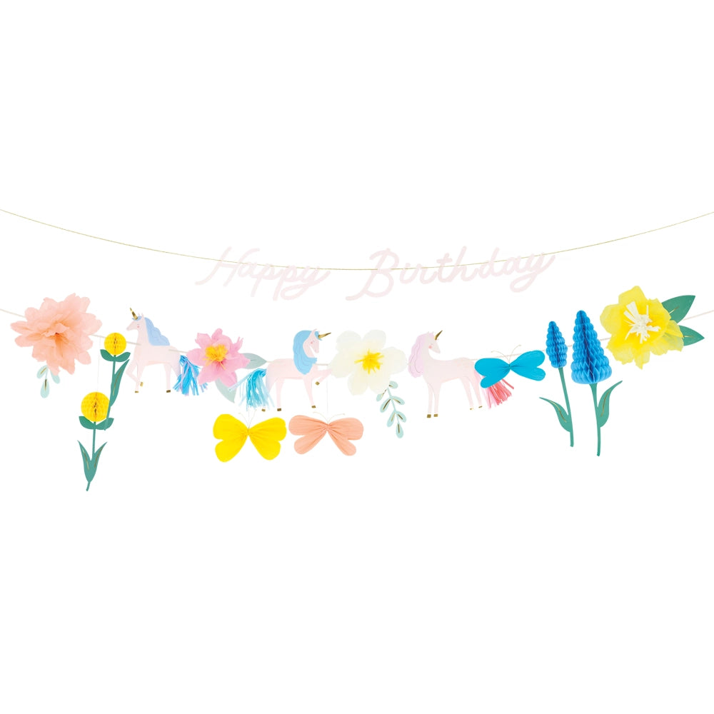 Η τέλεια γιρλάντα για το πάρτι σας, συνδυάζοντας μαγευτικούς Unicorns και λουλούδια του αγρού, ιδανική για θεματικά πάρτι μονόκερου ή πριγκίπισσας!