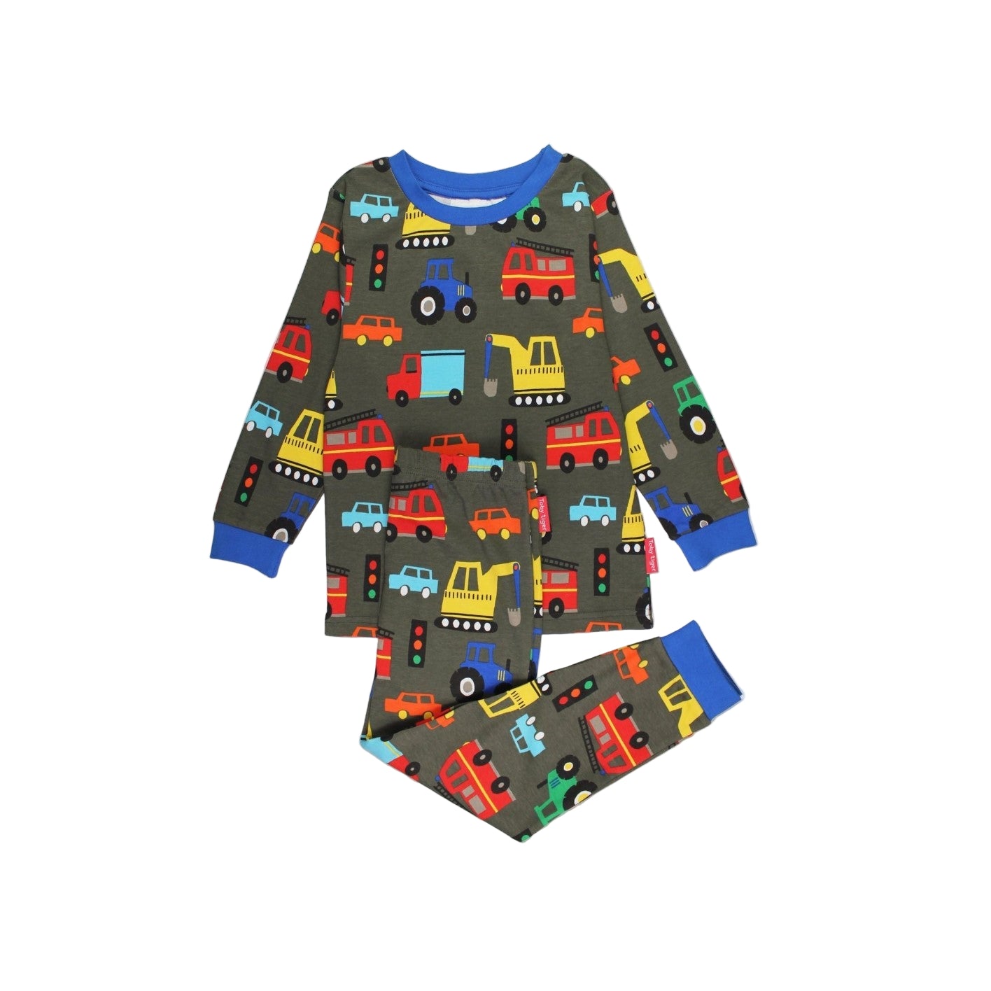Η ώρα του ύπνου με τις όμορφες παιδικές πιτζάμες δύο τεμαχίων από απαλό οργανικό βαμβάκι πιστοποιημένο από GOTS με τύπωμα οχημάτων.