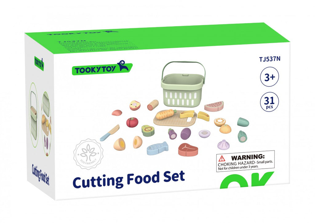 Ξύλινο σετ κοπής τροφίμων από την Tooky Toy, ιδανικό για δημιουργικό παιχνίδι μίμησης στην κουζίνα.Ένα ξύλινο σετ φαγητού κοπής όχι μόνο αναπτύσσει τη φαντασία του παιδιού, αλλά υποστηρίζει και την ανάπτυξη χειρωνακτικών δεξιοτήτων.