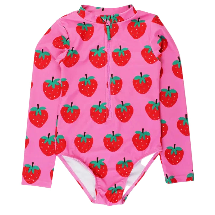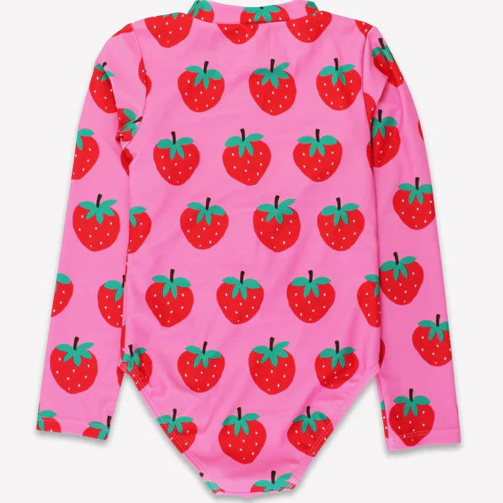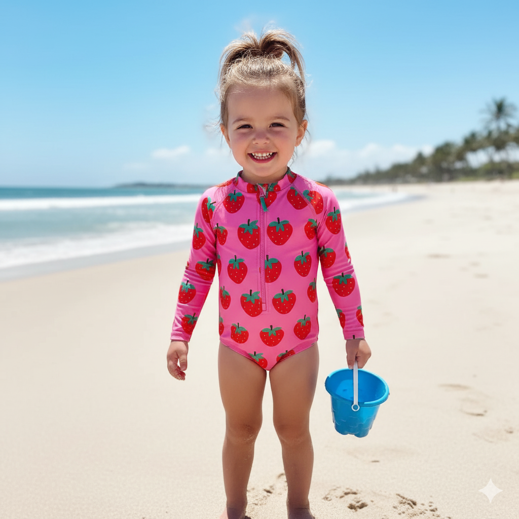 Το κολύμπι και το παιχνίδι στην παραλία ή στην πισίνα με προστασία από τον ήλιο είναι εγγυημένα με αυτό το ολόσωμο μαγιό UV με μακριά μανίκια και χαρούμενο μοτίβο φράουλας σε όλη την επιφάνεια. Κατασκευασμένο από 82% ανακυκλωμένο πολυεστέρα και 18% elastane, αυτό το μαγιό αποτελεί μια ασφαλή και βιώσιμη επιλογή. Με προστασία UPF 50+ και πιστοποιημένο υλικό OEKO-TEX, προστατεύει αξιόπιστα το ευαίσθητο παιδικό δέρμα από τον ήλιο.