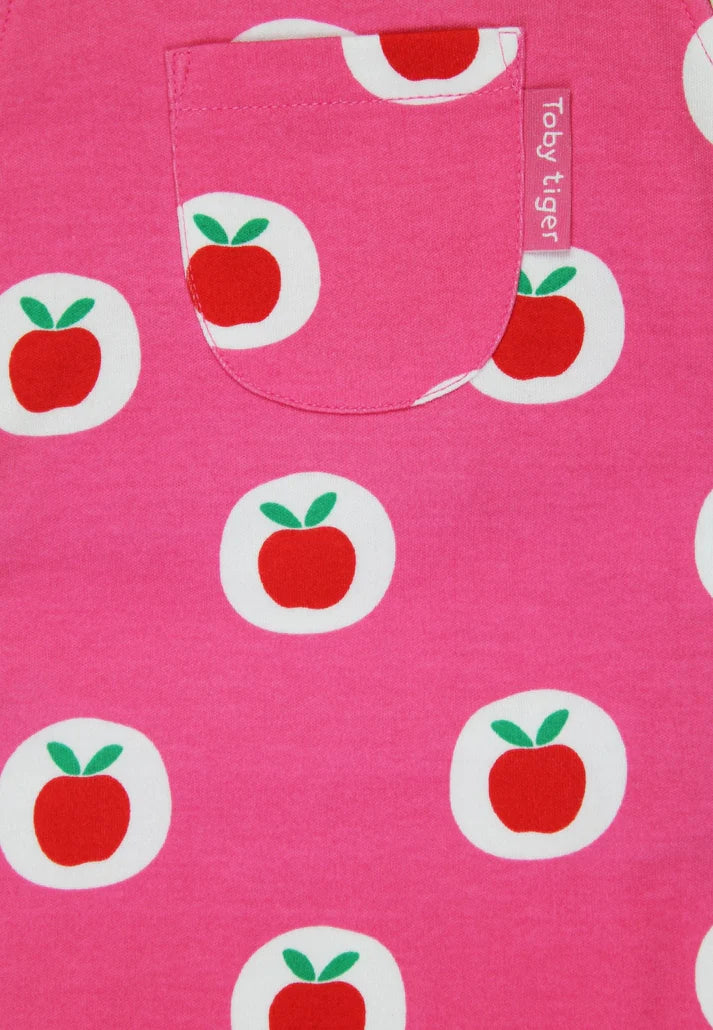 Η χαρούμενη φόρμα μας, κατασκευασμένη από απαλό οργανικό βαμβάκι, διαθέτει ένα φρέσκο τύπωμα μήλου σε έντονο ροζ χρώμα - ιδανική για κάθε διασκεδαστικό παιχνίδι. Η εύχρηστη τσέπη στο στήθος προσφέρει χώρο για μικρούς θησαυρούς που το μικρό σας θέλει πάντα να κρατάει κοντά του.