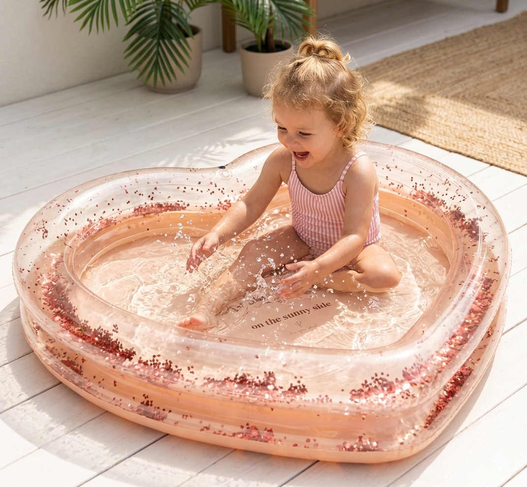 Διαφανής φουσκωτή πισίνα σε σχήμα καρδιάς από ανθεκτικό PVC σχεδιασμένη με glitter και κομφετί στο εσωτερικό. Διατίθεται σε 2 χρώματα:
