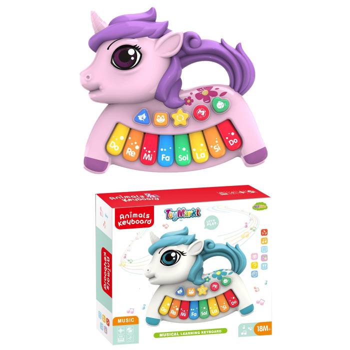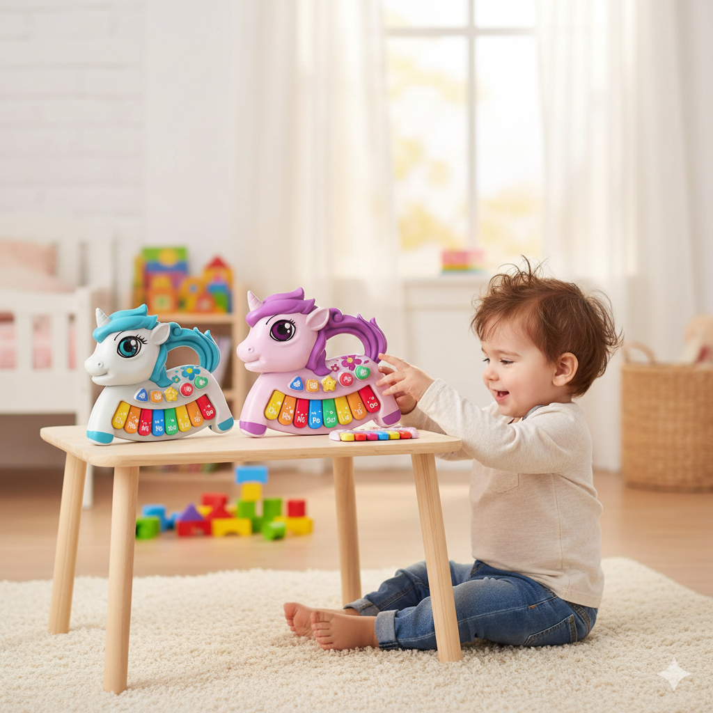 The Unicorn Baby Piano is a fun and interactive toy that combines music, light and play, ideal for children aged 18 months and up. With colorful keys and a cute unicorn design, it encourages your child to explore sounds and melodies in a fun way.