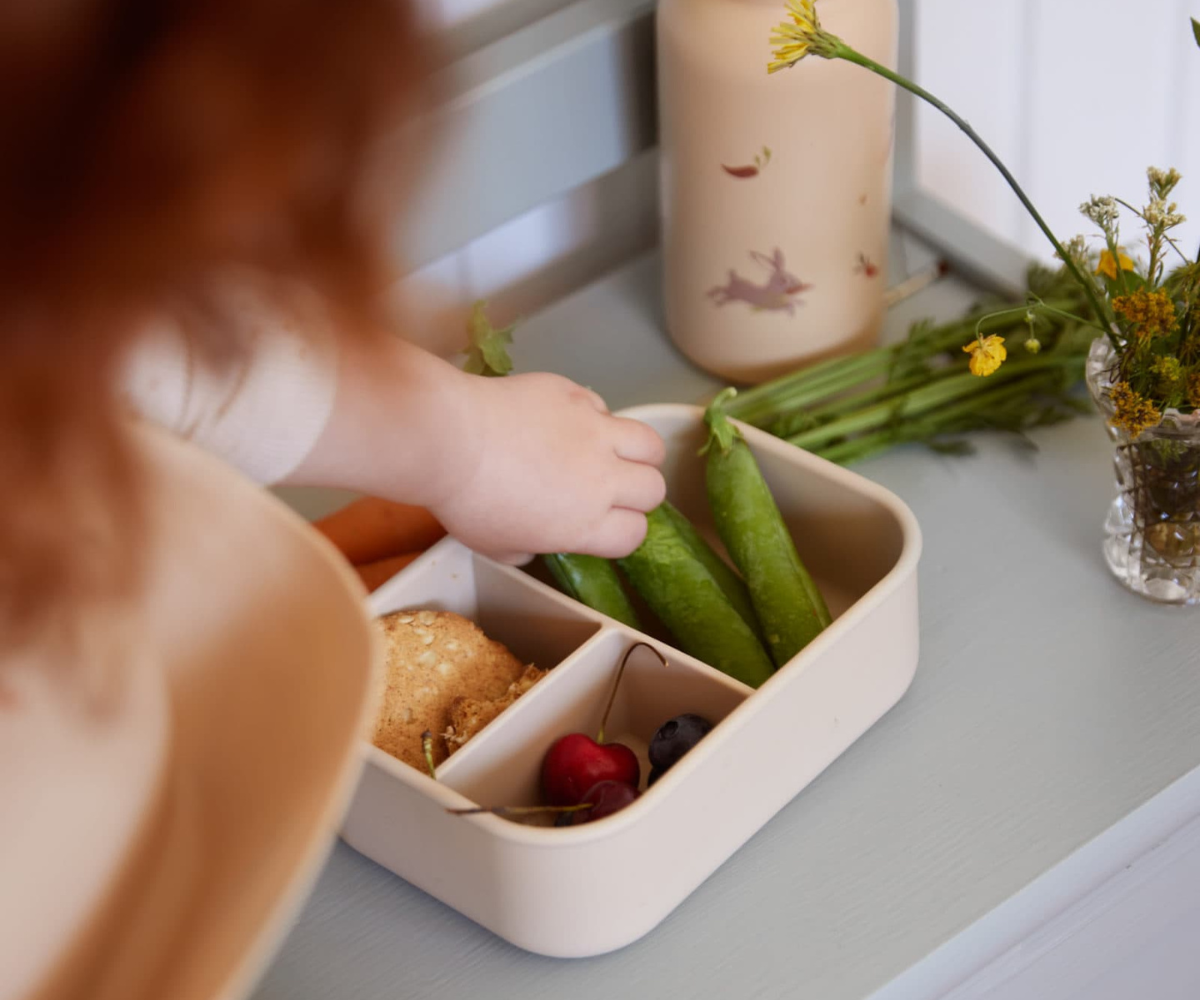 Cute and practical lunch box in 100% soft food-grade silicone. With its 700 ml size, there is plenty of room for snacks. The lunchbox is divided into 3 smaller rooms, so food can stay separated like many kids prefer it.
