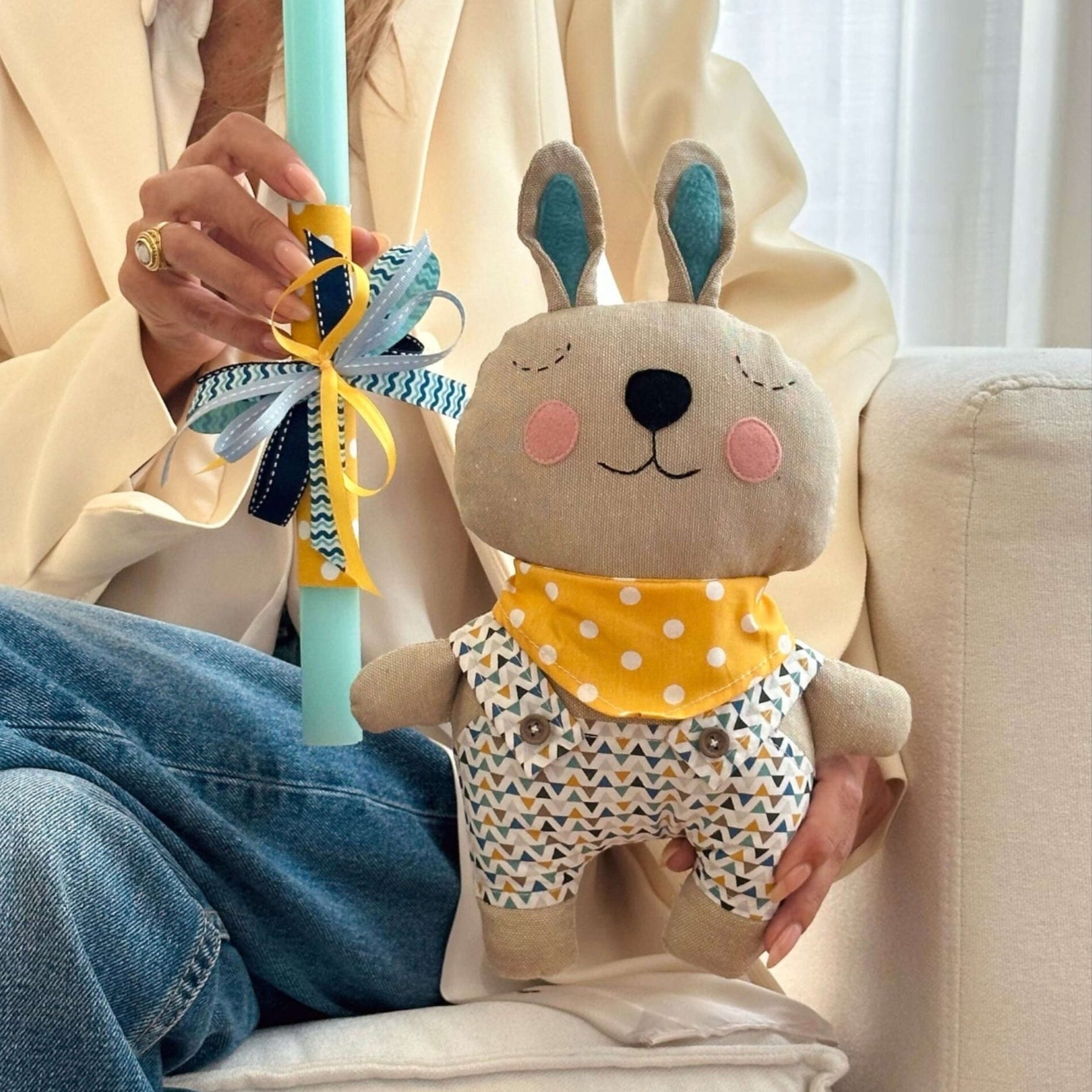 Easter candle with a handmade fabric bunny, sewn with cotton fabrics.