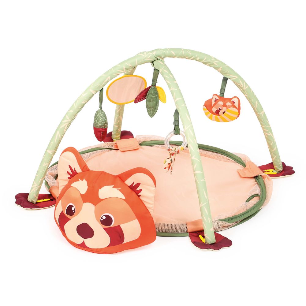 The removable arches and interchangeable toys allow you to adapt the space to your child’s needs at every developmental stage. A clever detail is the hidden storage compartment in the panda’s head, ideal for quickly tidying up toys and balls.