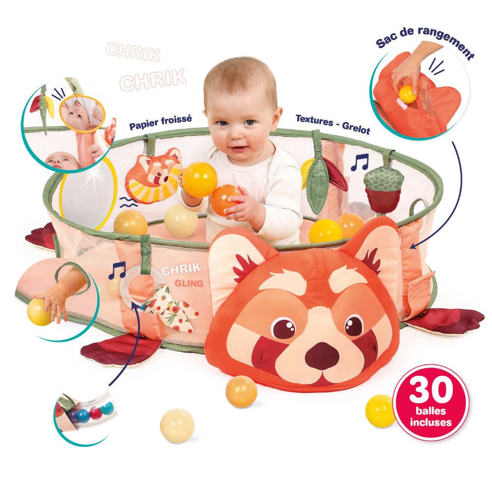 As your child grows, the gym easily transforms into a ball pit, thanks to the 30 colorful balls included in the package. It features five different activities, such as a mirror, rattles, a bead ring, and a variety of textures, helping to enhance sensory development, fine motor skills, and hand-eye coordination.